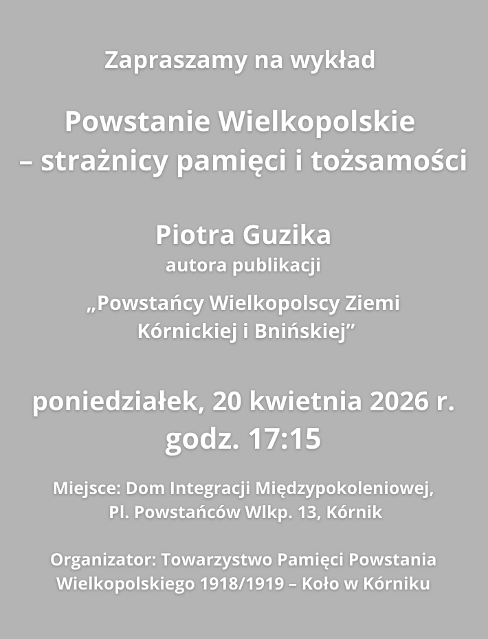 Zapraszamy na wykład „Powstanie Wielkopolskie – strażnicy pamięci i tożsamości” Piotra Guzika, autora publikacji „Powstańcy Wielkopolscy Ziemi Kórnickiej i Bnińskiej”, który odbędzie się w poniedziałek, 20 kwietnia 2026 r. o godz. 17:15.